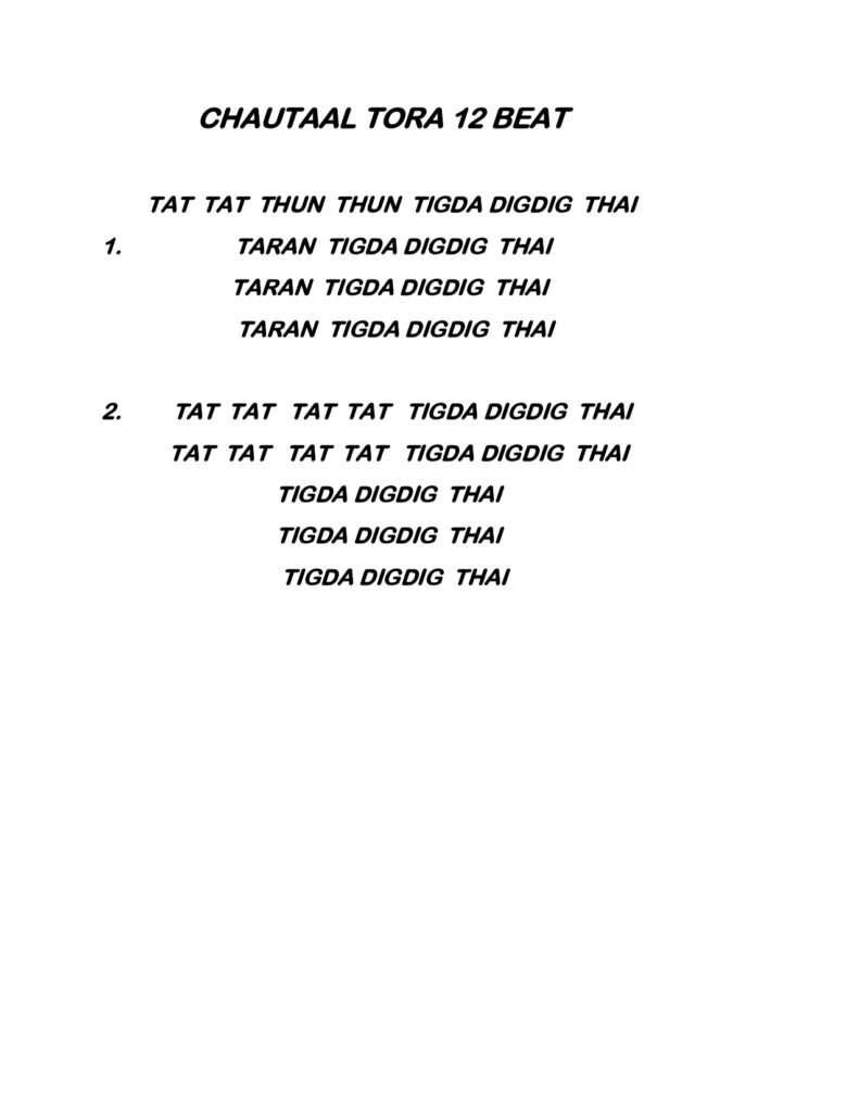 A classic Chautaal Toda might sound like this (spoken in bols, the syllables used in tabla):