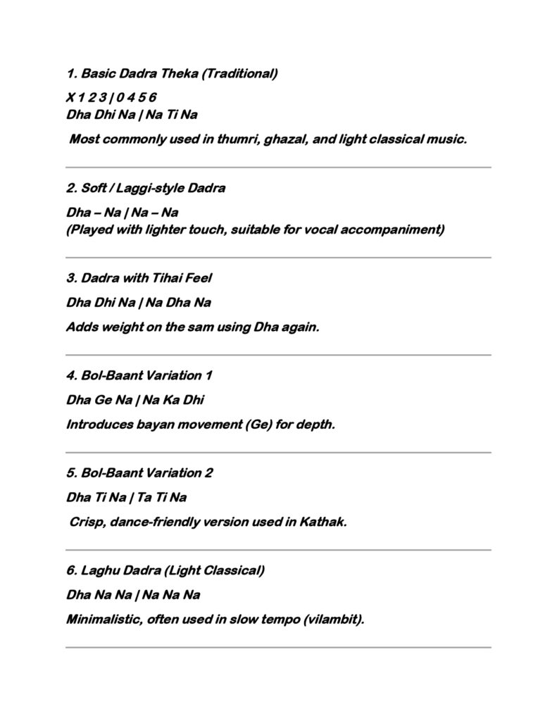 This theka forms the foundation for all improvisation, laggi, and palta development in Dadra Taal. A strong understanding of this pattern helps maintain clarity of sam and khali, even while experimenting creatively.