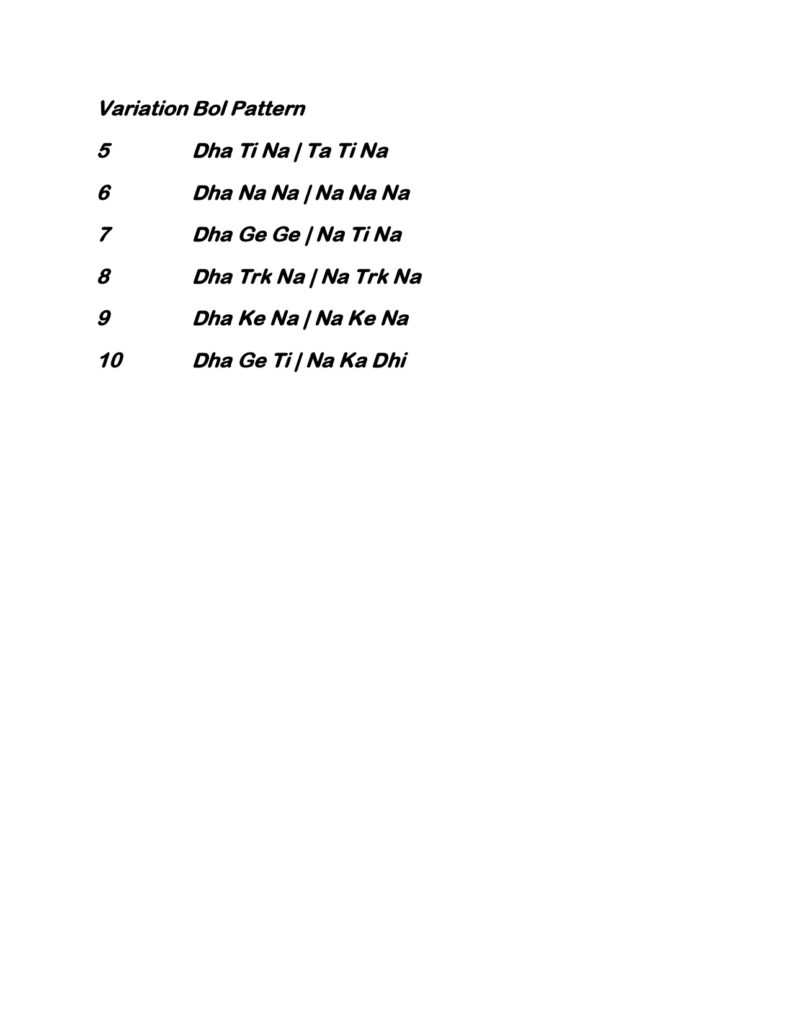 • Start practicing each variation in slow laya, focusing on clean bols.