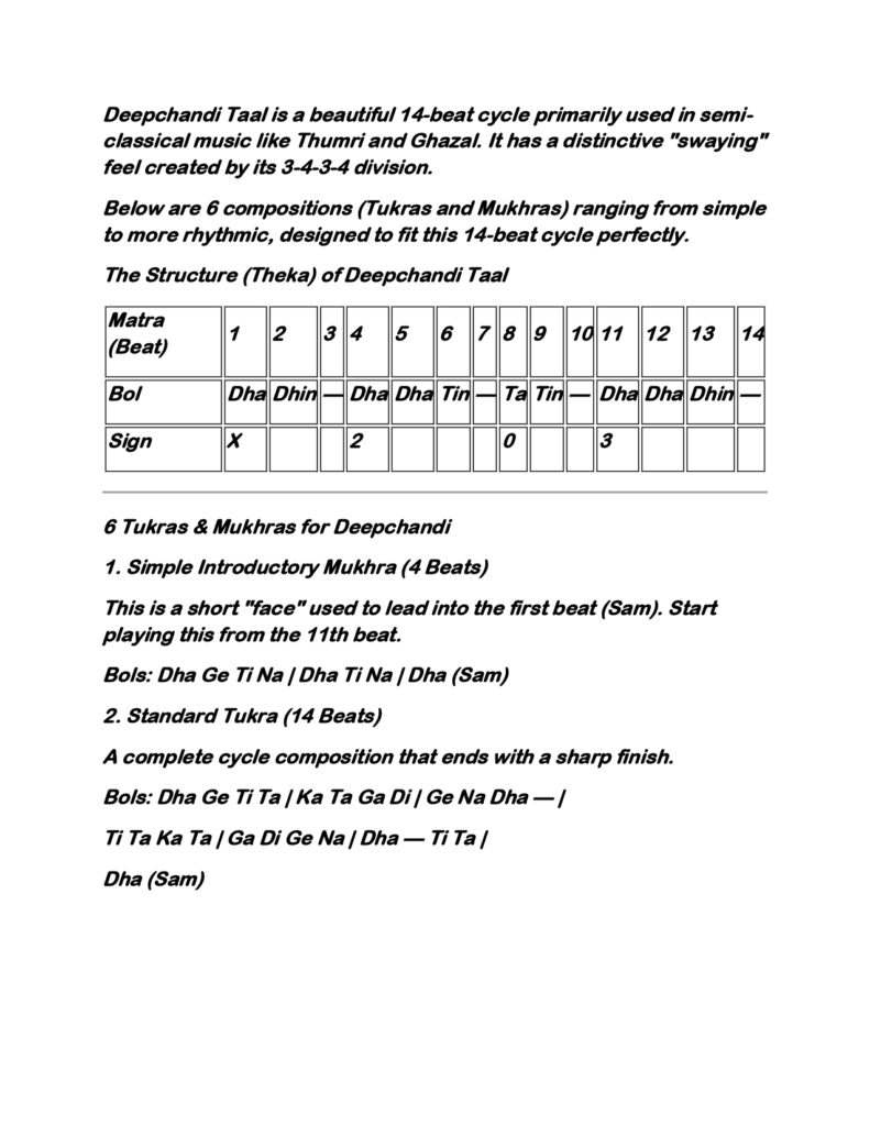 Below are 6 compositions (Tukras and Mukhras) ranging from simple to more rhythmic, designed to fit this 14-beat cycle perfectly.