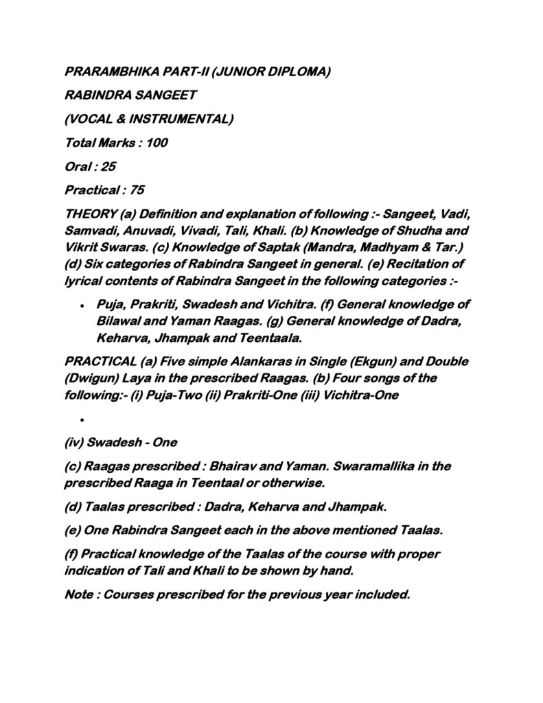 The Prarambhika Part-II Junior Diploma in Rabindra Sangeet (Vocal & Instrumental Studies) is more than an academic course—it is a journey toward musical maturity. By refining technique, deepening emotional expression, and understanding the essence of Tagore’s compositions, students move closer to mastering this timeless art. For those passionate about Rabindra Sangeet and eager to grow as musicians, Prarambhika Part-II is the gateway to excellence, tradition, and artistic fulfillment.