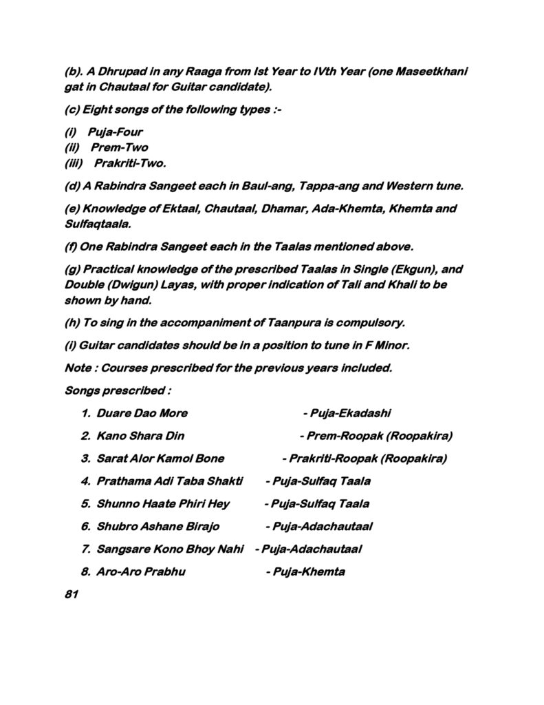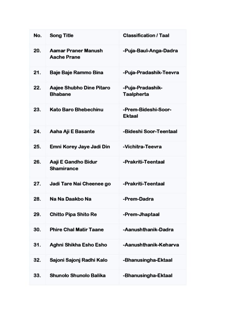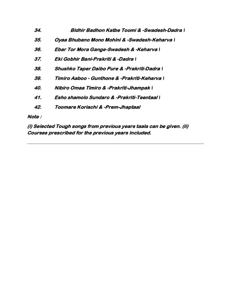 Rabindra Sangeet employs a variety of taals such as Dadra, Keharwa, Tritaal, and Jhaptal, often in softer, more lyrical forms. Students in Part-I must identify and perform compositions with correct rhythmic cycles. While raga purity is respected, Rabindra Sangeet allows creative freedom within boundaries. This balance between structure and expression is a key learning outcome at the fourth-year level.